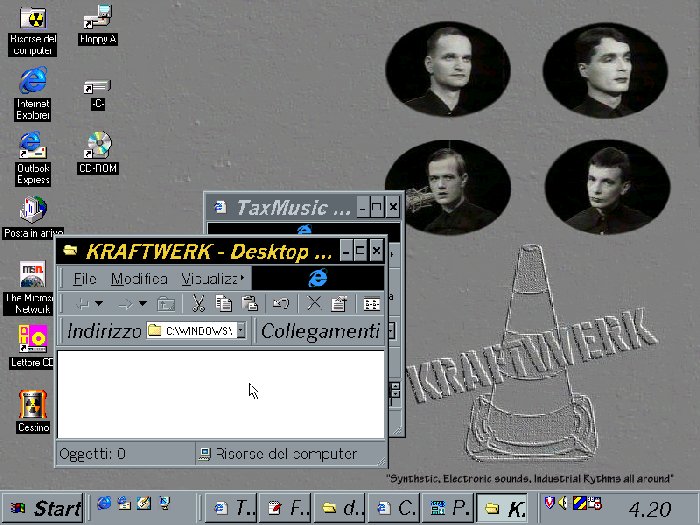 Ma se dei Kraftwerk siete prorio degli inguaibili fanatici, allora non potete assolutamente perdervi il mio KRAFTWERK DESKTOP THEME che ho costruito per voi! Valutatene subito wallpaper, icone di sistema e l'impostazione dei colori, e se vi piace scrivetemi subito chiedendomene una copia in formato ZIP! Solo allora potrete installarlo sul vostro Heimcoputer ed ammirarne cursori animati, sreensaver... ...ma sopratutto ascoltarne le Kraft-campionature associate ad ogni evento di Windows '95 Plus!